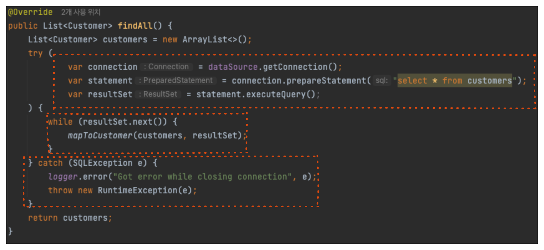 return jdbcTemplate.query("select * from customers", customerRowMapped); //sql,row mapper 전달