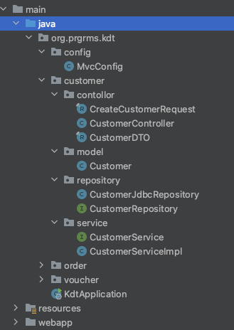 - controller, reposotory, domain(customer, voucjer,..), model(customer, email, ..) 로 나눠서 그룹핑한는 방식