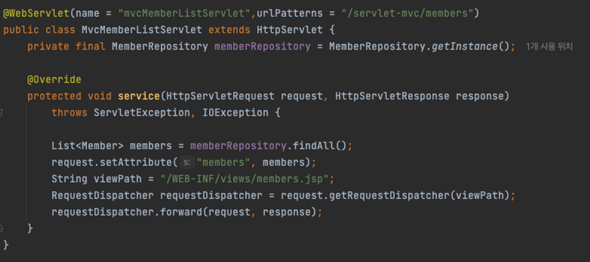 ์๋ ์ฝ๋๊ฐ Servlet์ ์์๋ฐ์ ๊ตฌํํ Controller ๋ ์ด์ด๋ก model ์ญํ ์ ํด์ค servletRequest์ ๋ฐ์ดํฐ๋ฅผ ๋ด์ view๋ก ์ ๋ฌํด์ฃผ๋ ๊ฒ์ ํ์ธํ ์ ์์ต๋๋ค.