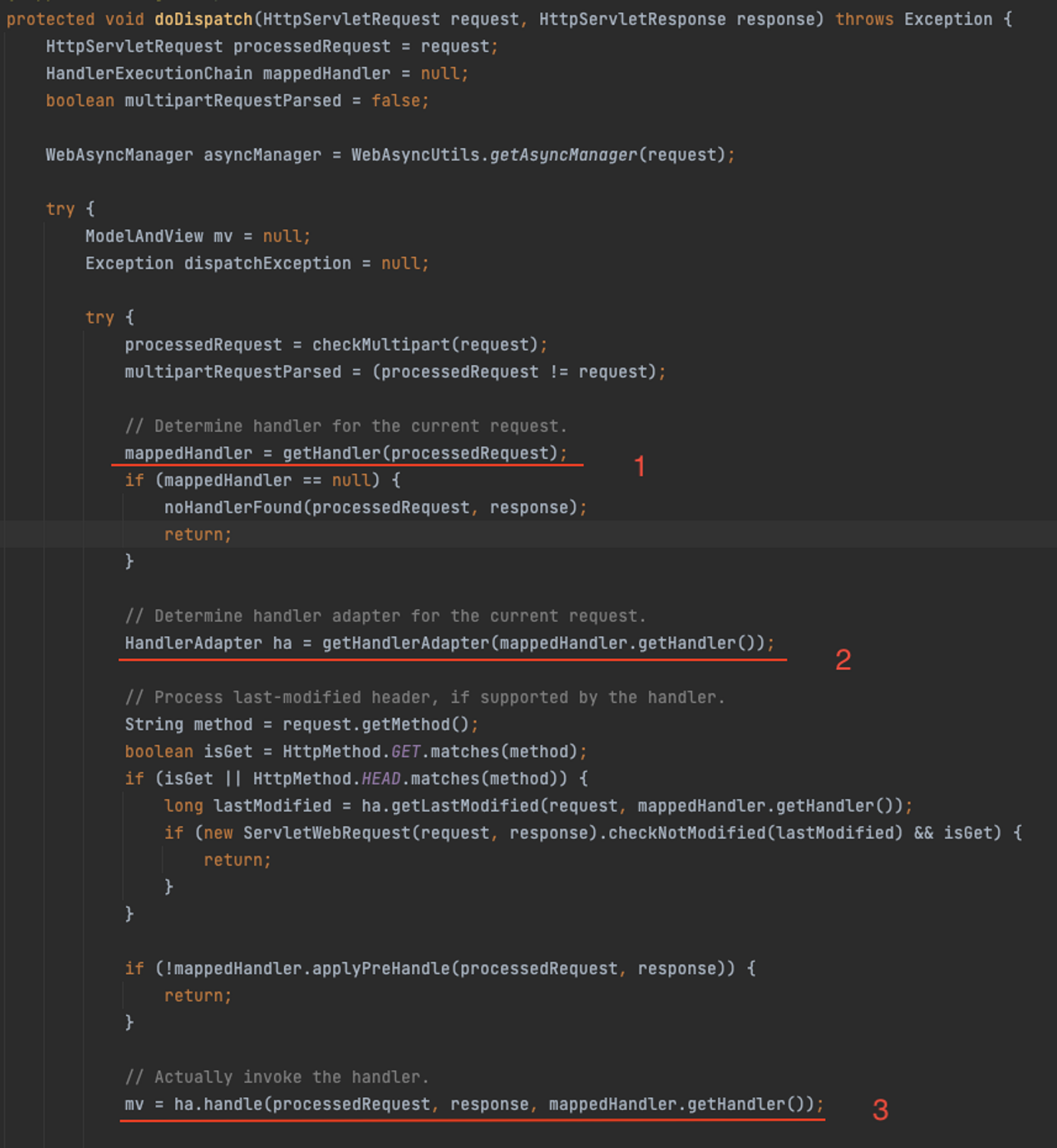 ๊ฐ๊ฐ์ ์ธํฐํ์ด์ค๋ค์ด ์ด๋ป๊ฒ ์ฌ์ฉ๋๋์ง ์ฝ๋์ ํจ๊ป ์ดํด๋ณด๊ฒ ์ต๋๋ค. ์๋ ์ฝ๋๋ DispatcherServlet์ ์ฃผ์๋ฉ์๋์ธ doDispatch์ ์ผ๋ถ ์ ๋๋ค.