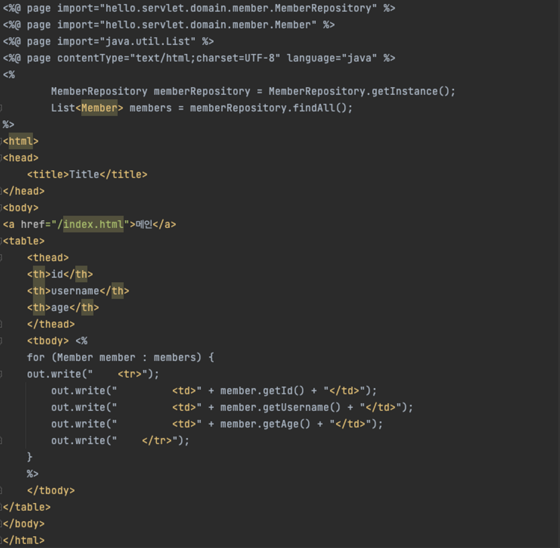 ํด๋น ์ฝ๋๊ฐ ๋ฐ๋ก JSP ํ ํ๋ฆฟ ์์ง์ ์ฌ์ฉํ์ฌ ๋์ ์ธ ํ๋ฉด์ ๊ตฌ์ฑํ๋ ๋ฐฉ์์ ๋๋ค. HTML์ฝ๋์ Java ์ฝ๋๊ฐ ๋ณต์กํ๊ฒ ์ฝํ์์ด ์ผํ๋ด๋ ์ ์ง๋ณด์๊ฐ ๊ต์ฅํ ํ๋ค์ด ๋ณด์ด๋ ์ฝ๋์ ๋๋ค.