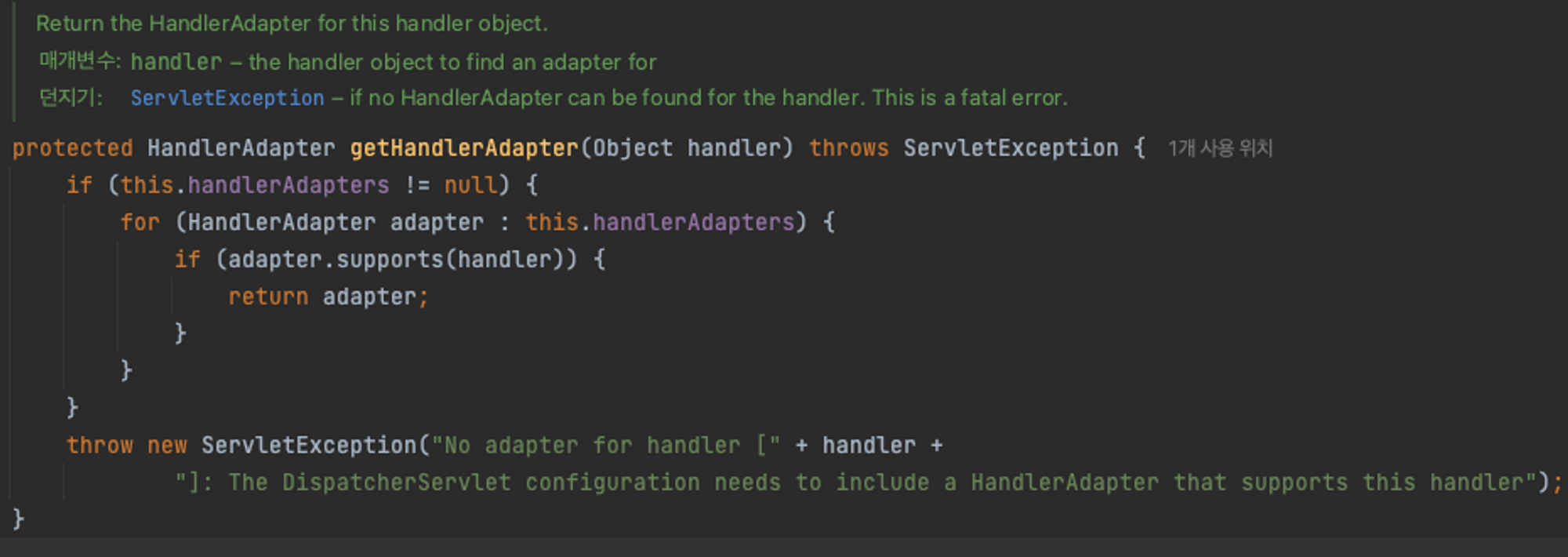 1. getHandler๋ฅผ ํธ์ถํ์ฌ handleMapping๋ค ์ค ์์ฒญ์ ์ฒ๋ฆฌํ (request์ URL๊ณผ ๋งค์นญ๋๋) handler๊ฐ ์๋์ง ํ์ธํ๊ณ ๊บผ๋ด์ต๋๋ค.